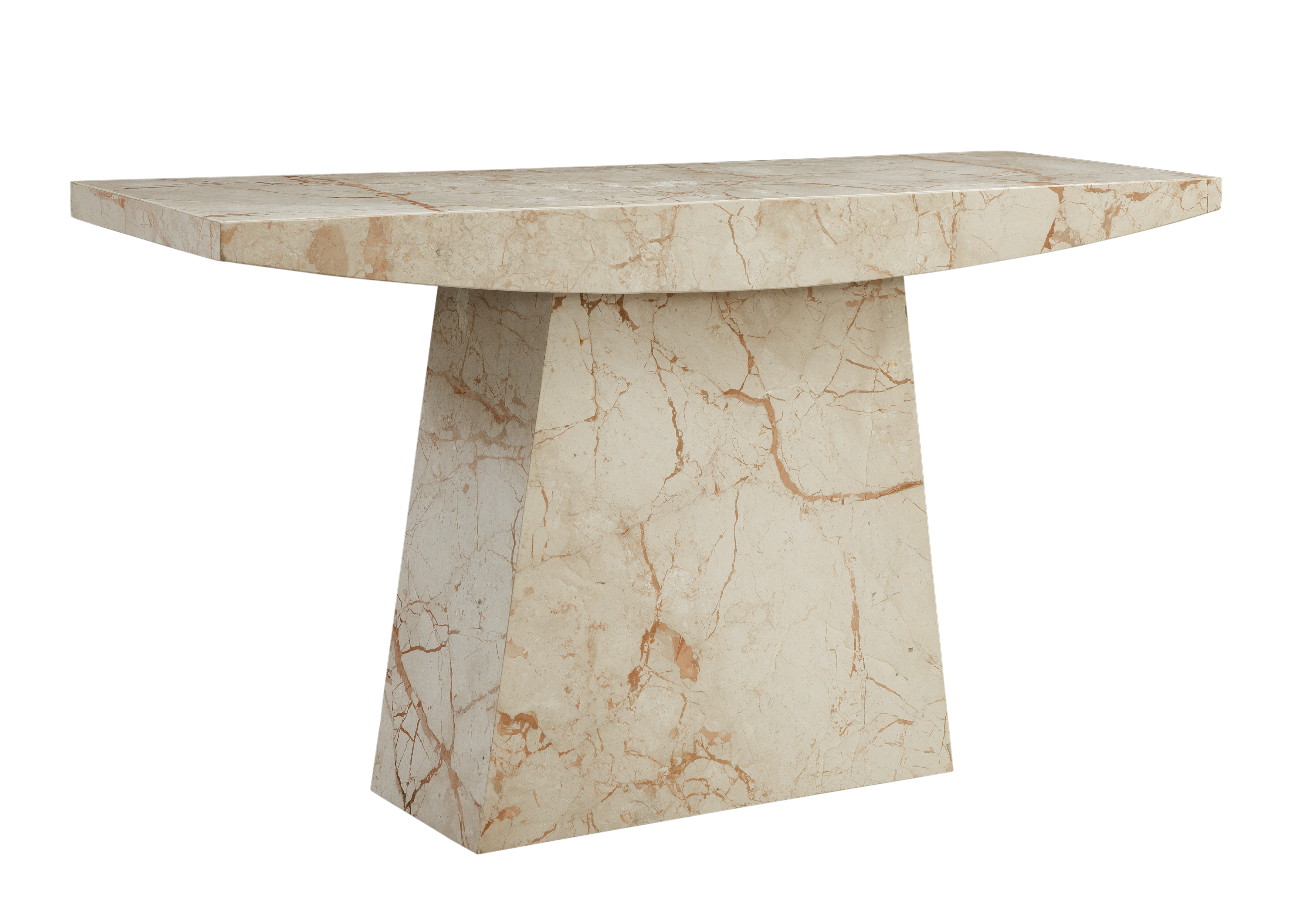 The Fiona Console makes a dramatic statement with its architectural-inspired modern design. Crafted from select Italian marble in a crema finish, the ivory stone features striking red veining that gives each piece its own unique character. The natural variations in the marble create a beautiful one-of-a-kind design, making this console a stunning addition to any contemporary space.