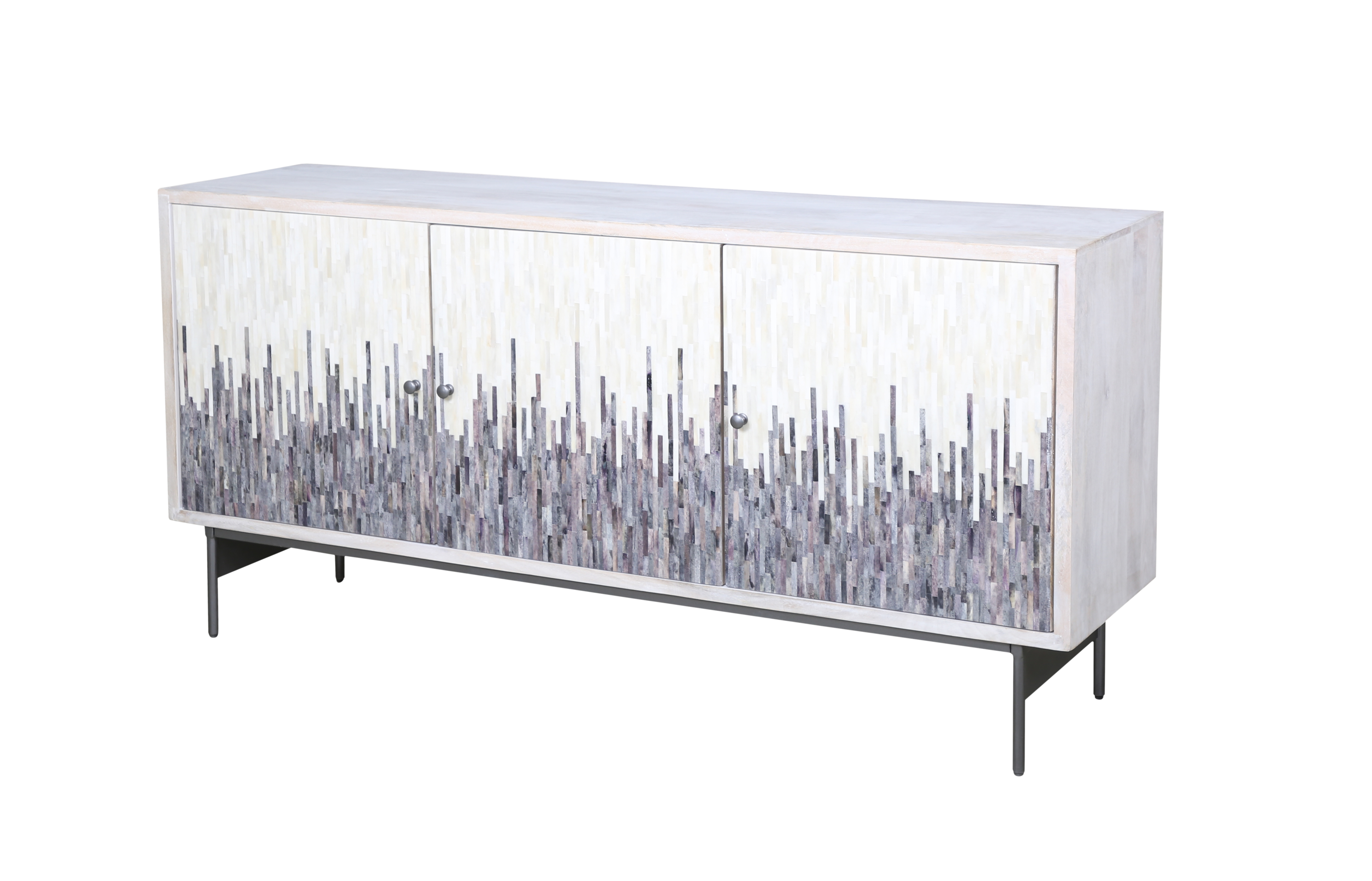 The Zooey server embodies a refined coastal elegance, crafted from white-wash mango wood with striking ivory and blue bone and resin inlays. Set atop slender metal legs, this piece features three doors that open to reveal ample storage, seamlessly blending functionality with style. Its contemporary design is accented by sophisticated metal hardware, presenting a luxurious yet understated addition to any high-end decor.